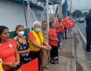 Funcionarios del Centro de Salud de Pedregal, junto con el grupo de Adultos Mayores, realizaron una cadena humana promoviendo la prevención del VIH y otras enfermedades de transmisión sexual.