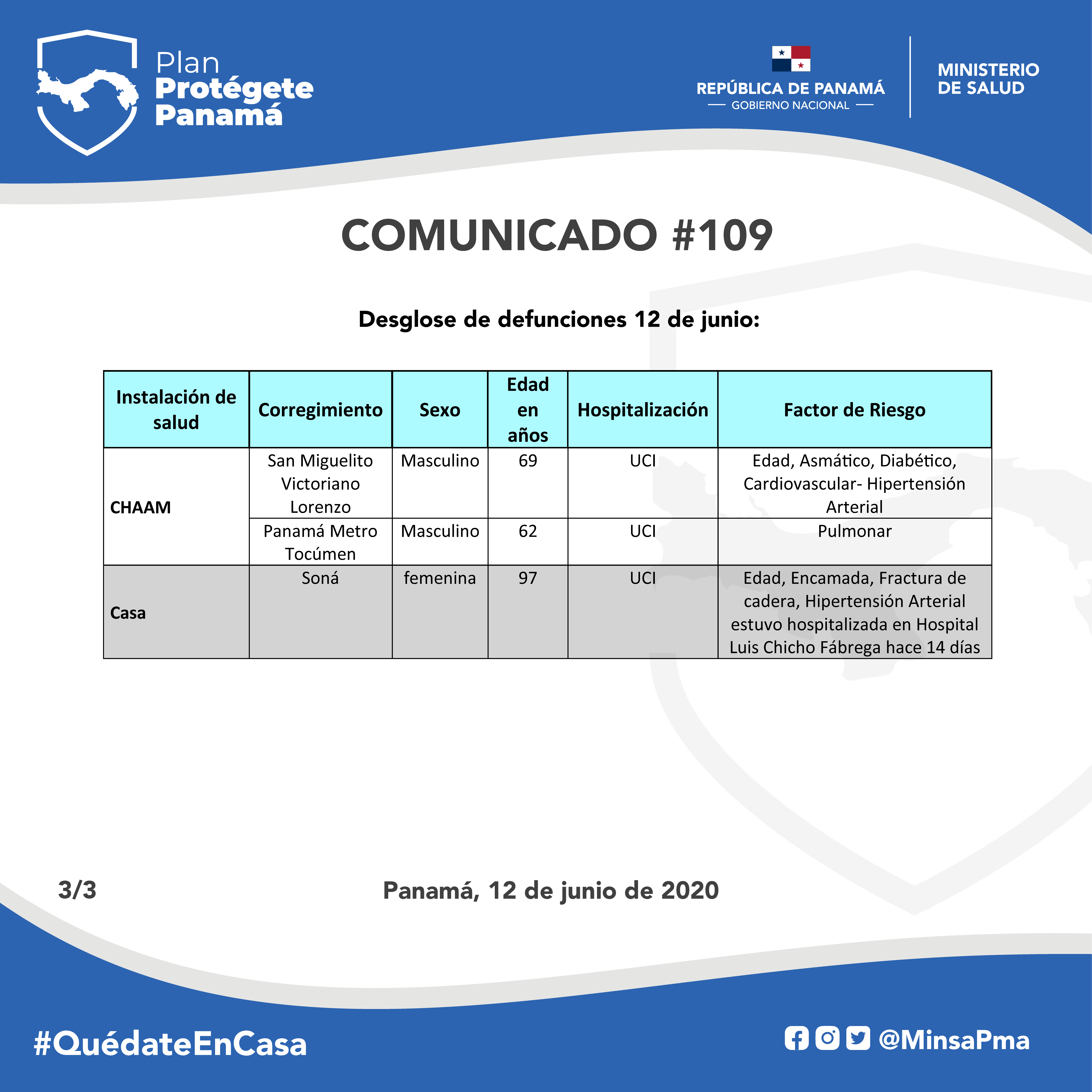 Toda información oficial referente al COVID-19 en Panamá y las acciones del Gobierno Nacional se comunican a través de las cuentas oficiales del MINSA en las principales redes sociales y en su página web (www.minsa.gob.pa y yomeinformopma.org) también están disponibles en el centro de atención de llamadas 169 y el número de WhatsApp 69972539.