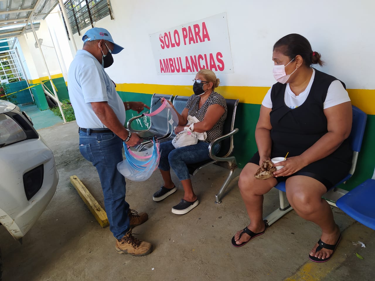 Otra de las acciones por los EUT del Centro de Salud de Pueblo Nuevo fue la entrega de pantallas faciales y promoción de la salud enfocados en los temas de bioseguridad a vendedores, conductores de busitos y taxis en La Gran Estación y Monte Oscuro.